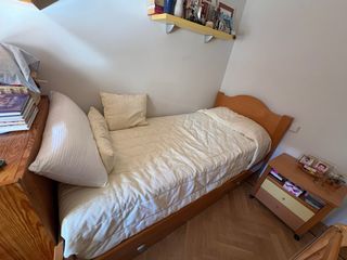 Vendo conjunto de dormitorio juvenil en madera de haya compuesto por: - Cama (incluye colchón): largo 2,10 m; ancho 1,15 m. Colchón: 1,05 × 2,00 m. - Mesita de noche: alto 54 cm; ancho 40 cm; fondo 38,5 cm. - Estantería: alto 2,24 m; ancho 2,40 m; fondo 28 cm. - Cómoda (4 cajones): alto 97 cm; ancho 60 cm; fondo 47 cm. - Mesa de escritorio (con cajones): ancho 1,56 m; alto 76 cm; fondo variable de 1,07 m a 60,5 cm. - 5 baldas: grosor 3 cm; ancho 90 cm; fondo 26,5 cm. - Espejo: alto 1,70 m; ancho 80 cm. Precio indicado para el conjunto pero se venden por separado los muebles.