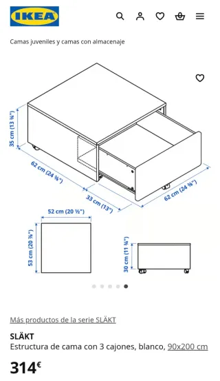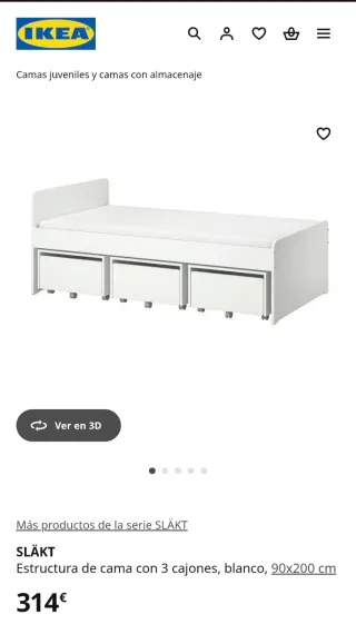 Estructura de cama blanca de IKEA, modelo SLÄKT, con tres cajones. ( No incluye somier) - Medidas: 90x200 cm. - Diseño juvenil y funcional. - Desmontado, buen estado.