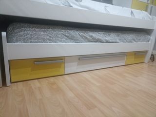 Cama individual doble con cajones en perfecto estado. Es ideal para una habitación juvenil. - Estructura robusta y resistente. - Tres cajones amplios para guardar ropa u otros objetos. - Dos colchones incluidos. - Diseño moderno y combinable con cualquier estilo de decoración.