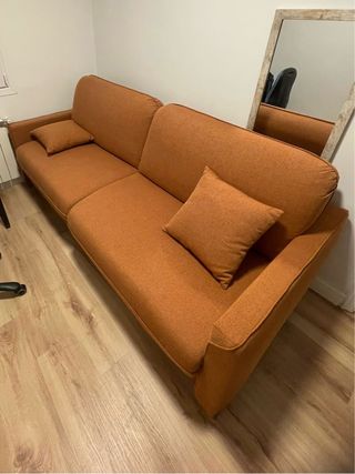 Sofá cama de tela en tono marrón anaranjado. - 4 plazas sentadas en sofá. - Incluye colchón king size 180×200. - Diseño moderno y funcional. Super nuevo, poco uso del sofá para sentar y uno solo uso del colchón. No lo usamos por falta de espacio en nuestro piso y en la habitación donde se encuentra.