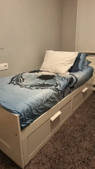 Cama nido de Ikea con cajones de almacenamiento. - Diseño moderno y funcional. - Cajones amplios para guardar ropa de cama o juguetes. - Estructura robusta y duradera. Tiene en las agarraderas de los cajones, una rayadura de la pintura, como se puede apreciar en la foto, porque las mordió un perrito. Se regala el colchón, es usado. El que lo quiera.