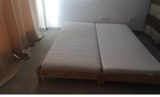 Cama nido extensible de madera, ideal para aprovechar el espacio. Su diseño es sencillo y funcional. - Estructura robusta. - Cajones integrados para almacenamiento. Incluye dos colchones de Ikea Se abre y mide 1,60 Se regalan varias sábanas