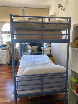 Litera de metal con un diseño clásico, ideal para optimizar el espacio. Modelo Tromso-Ikea - Estructura de tubo de hierro. - Colores disponibles: azul Tercer somier nido Incluye 2 colchones ikea sin usar La vendo desmotada. Las fotos son actuales porque la cambio Conservo manual de montaje
