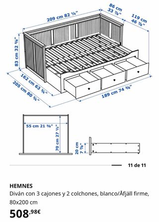 Cama nido de Ikea, un mueble versátil y funcional para cualquier habitación. - Diseño moderno y práctico. - Amplio espacio de almacenamiento con cajones. - Dimensiones: 209 cm (largo) x 86 cm (alto) x 119 cm (profundidad). - Profundidad de los cajones: 55 cm.