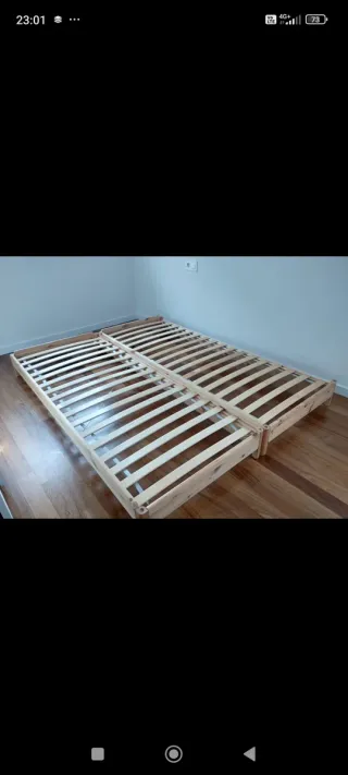 Cama individual con cama nido extraíble. Un colchon es ikea el Otro no. Ambos en perfecto estado. - Estructura de madera robusta. - Diseño moderno y funcional. La cama al volverla a armar habra que reforzar un tornillo ver foto. La cama de abajo no rueda bien. Esta armada. Tienen que venir a desarmarla para llevarsela.