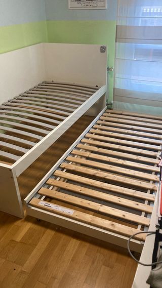 Cama nido individual con un diseño moderno y funcional. Para colchón de 90x200. - Estructura principal de modelo Slakt de Ikea con apenas 2 años. Está impecable. - Cama nido inferior estructura metal y frontal madera maciza. Admite colchón hasta 25cm. - Los 2 Somier de láminas de madera.