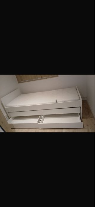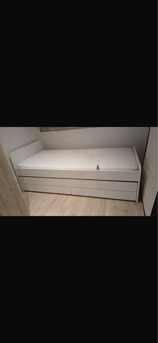 Cama individual IKEA con cajones + colchón buen estado estructura blanca y cajones de almacenamiento inferiores. Muy práctica para aprovechar espacio. Incluye: Estructura de cama Somier de láminas Cajones amplios (perfectos para ropa, mantas, etc.) Colchón incluido Medidas aproximadas: 90x190/200 cm Estado: Muy bien cuidada, limpia y en buen estado general Ideal para habitación juvenil, invitados o pisos pequeños