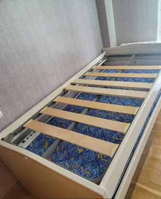 Cama nido con arcón, ideal para espacios pequeños. Se encuentra en buen estado. - Incluye colchónes, uno de 90 x 190 y otro de 80 x 180 - Arcón de almacenaje debajo de la cama.Somier inferior de laminas de madera. En buen estado, solo usado en vacaciones. El edredon no va incluido, ni tampoco lo que esta dentro del arcón.