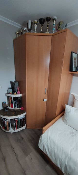 Conjunto de dormitorio juvenil fabricado en madera de pino. Incluye dos camas nido con colchon (tiene unos pequeñis desgastes que se ven en las dos ultimas fotos) EL DORMITORIO ESTA COMPUESTO POR: •3 Lejas de pared, una de 1m y dos de 0,80m •Escritorio en forma de L: mide 2,40m de largo x 0,51m de ancho y 1,22m de largo x 0,51m de ancho •Cajonera debajo de escritorio de 0,75m de alto •Estanteria con dos lejas de 1,23m de alto x 0,50m de ancho •2 Armarios de 2,40m de alto x 0,50m de ancho •Arco con puertas y lejas de 2,10m de largo •Cama nido con dos colchones de 90x190cm y cajoneras para almacenaje.