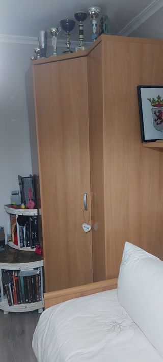 Tiene marcas de uso pero está bien conservado. Es de la marca Exojo de La Roda. Tiene gran capacidad de almacenaje, ya que el armario y los cajones tienen de fondo lo mismo que el ancho de la cama. Se vende la estructura sin colchones. Se recoge en el domicilio sin desmontar. Corre a cargo del comprador