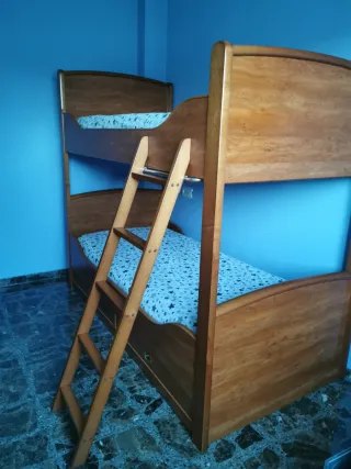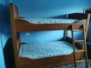 Se vende cama nido de madera maziza en buen estado. Incluye los dos colchones y 1 cubre colchón. Se puede ver sin compromiso y tendrían que venir a recogerlo. -Medidas: • Cajetín de arriba: Largo: 2,03 m Ancho: 1 m • Cama de arriba: Largo: 1,90 m Ancho: 92 cm • Cajetin de abajo: Largo: 1,95cm Ancho: 98 cm • Cama de abajo: Largo: 1,85 cm Ancho: 90 cm • Cajones: Largo: 78,5 cm Ancho: 39,5 cm Altura: 20 cm • Altura cama completa: 82 cm