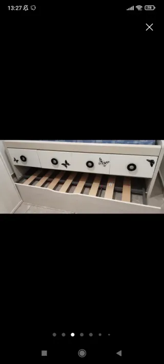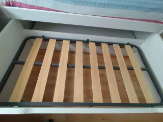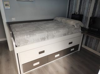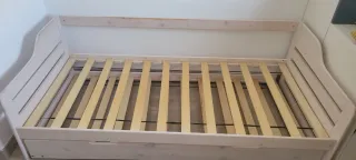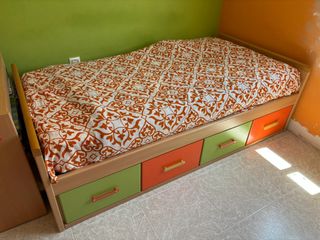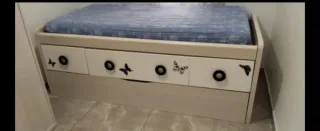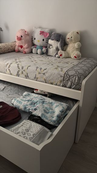 Cama nido 90 cm, sin colchón, 4 cajones de gran capacidad. No se usado nunca, solo estaba por decoracion. En perfectas condiciones, madera fuerte y resistente, sin arañazos ni golpes, ningún desperfecto. Esta desmontada, solo para recoger en cualquier momento. Badajoz