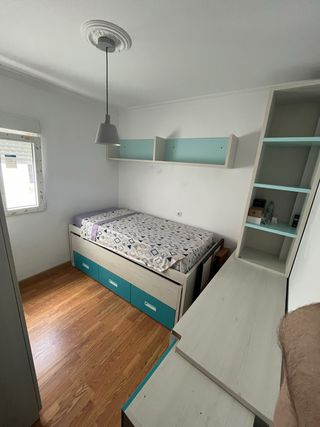 Muebles de habitación juvenil en perfecto estado, color turquesa y blanco roto, incluye cama nido con cajones amplos de almacenaje, estanterías y escritorio a juego, estanterías de pared con baldas turquesa, armario amplio. Habitación, cuarto, infantil, juvenil..