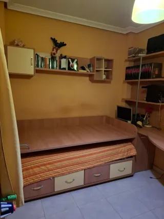 Habitación juvenil en muy buen estado, fabricada en madera de cerezo Esta compuesta por cama nido y la cama 90x190. La de abajo con ruedas y cajones Estanterias, repisa, zapatero y escritorio. Posibilidad de transporte.