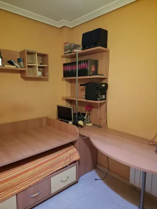 Conjunto de dormitorio juvenil fabricado en madera, ideal para optimizar el espacio. - Cama nido integrada. - Diseño funcional para habitaciones juveniles. - Con zona escritorio, estanteria de suelo a techo y librería sobre encimera. - Cuatro estantes aparte. - Puente y estanteria bajo puente. En muy buen estado.