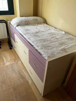 Cama nido con espacio de almacenamiento integrado. Ideal para optimizar el espacio en habitaciones. - Medidas de la cama principal: 190x80 cm, con sus colchones - Tres cajones amplios para guardar objetos. - Diseño moderno en tonos blanco y lila. ENTREGA EN MANO EN CANDELARIO, SALAMANCA