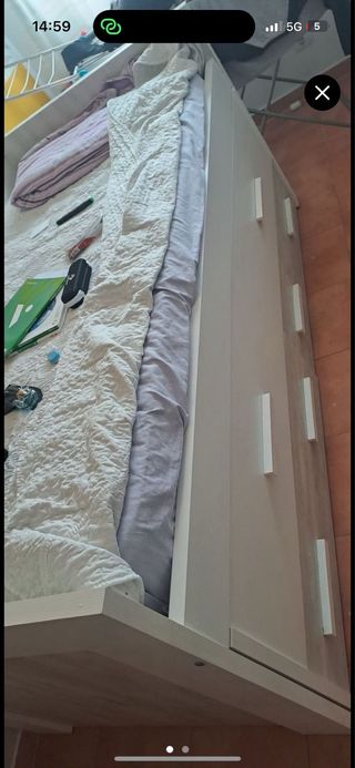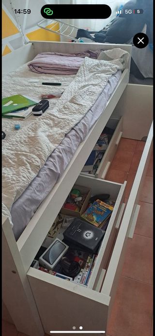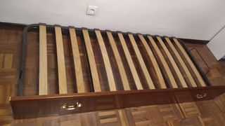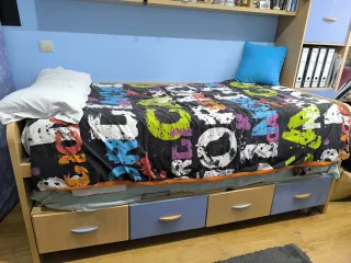 Cama individual con un diseño práctico y funcional. - Medidas de 90 x 185 cm. - Incorpora ruedas para facilitar su movilidad. - Dispone de cajones de almacenaje integrados. - Se puede incluir colchon. - tenemos la estructura de la cama de arriba para hacerla nido, pero falta la madera de la cabecera que nos quedamos.