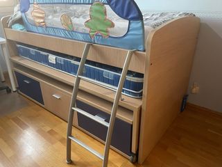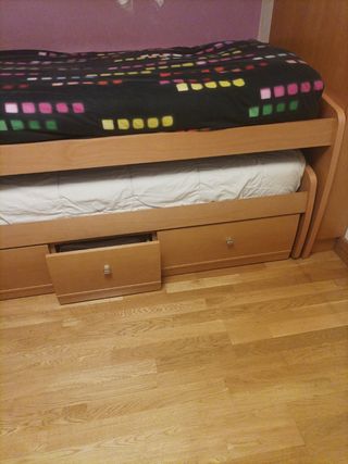 Cama estilo Compacto. Con cama inferior también de 90 y 3 enormes cajones. Muy buena calidad. Tiene escalera para la cama superior y barrera para evitar la caída de la almohada en la cama inferior (en las fotos no aparece, porque la tengo quitada). También frenos para evitar desplazamiento de la cama inferior. Regalo colchón de 90, somier superior (en la inferior no es necesario) y barrera anti-caida. Está en muy buen estado, aunque hay pequeño signos por el paso del tiempo. Hay que desmontarla por parte del comprador. Transporte y retirada por parte del comprador.
