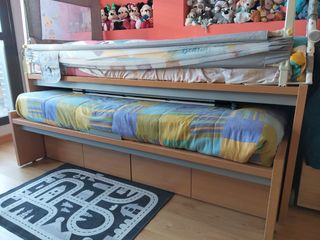 Urge vender. Cama nido individual con un diseño moderno y funcional. - Estructura de madera. - Colchón de tela. - Cajón inferior con tirador. Se regalan los colchones y la colcha. La cama de debajo se levanta hasta quedar a la misma altura que la superior.