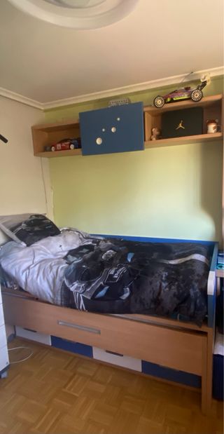 Se vende dormitorio juvenil completo. Ya desmontado y embalado. (235CM) - Cama nido doble con 4 cajones en la parte inferior. - Mesa de estudio. - Estantería metálica con 5 baldas pequeñas y 2 baldas grandes. - Mueble bajo con 4 cajones y 2 nichos. En muy buenas condiciones y precio negociable. Si estan interesedos no duden en hablarme, estaré encantada de resolver sus dudas.😃