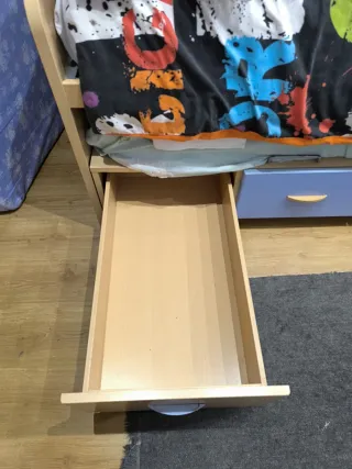 Cama nido para colchón de 90cm. Incluye cuatro cajones para almacenamiento. El color es madera y lila.En la foto no se aprecia bien el color,en las fotos de descripción,hay una foto q se ve bien el color Regalo el colchón (seminuevo),el colchón es para la cama principal,la cama de abajo va sin colchón. Altura del suelo a la cama 85cm. Está desmontada - Estructura de madera. - Con refuerzos