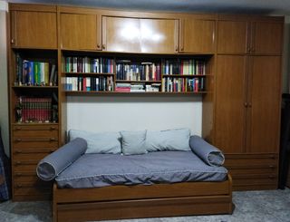 Mueble de madera, puente con armario, cajonera, estantería y altillos para almacenaje. Cama nido de 90 con cama de arrastre, con somieres y colchones incluido. Ideal piso de estudiantes o segunda residencia.