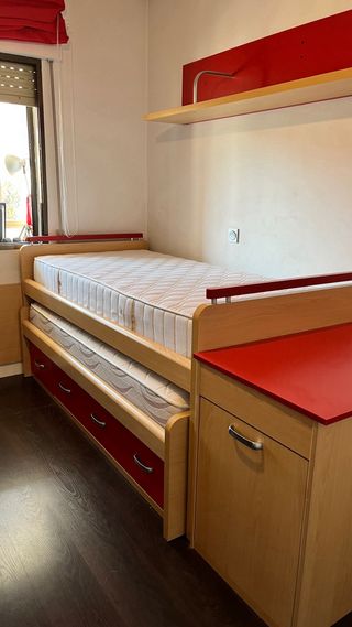 Mueble infantil de madera maciza en muy buen estado. Incluye cama nido con estructura robusta y cajón inferior con ruedas. El conjunto está compuesto por una cama individual y un escritorio a juego. - Estructura de madera maciza. - Cama nido con cajón que lleva cama incorprada y un arcon integrado. - Escritorio integrado con cajonera integrada. - Estanteria con cajones para libros y objetos decorativos. - Buen estado de conservación - Colchones incluidos