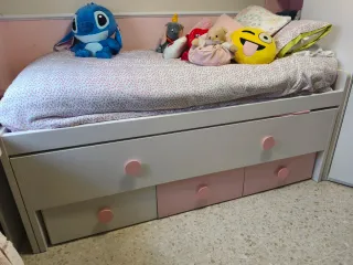 Cama nido con un diseño moderno y funcional.Lo cambio por cambio de decoración. - Estructura principal de madera. -La cama de abajo se queda a la altura de la otra cuando se abre. - Combina tonos rosas y blancos,si no quieres rosa se pueden quitar los tiradores y cambiarlos. Regalo los colchones si los quieres. Más cosas en mi perfil