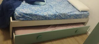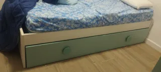Cama nido con espacio de almacenamiento integrado. - Cajones amplios para guardar ropa o juguetes. - Diseño funcional y versátil. En la ultima foto puede verse el desperfecto. Por eso el precio. Pero no impide oara nada su uso y no se ve. Regalo los dos colchenes sin apenas uso.