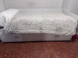 Cama nido de Ikea con un diseño moderno y funcional. Ideal para habitaciones infantiles o juveniles. - Estructura de madera. - Dos cajones amplios para almacenamiento. - No incluye colchón porque es de 90cm. Tiene un arañazo que aparece en las fotos.. no impide para nada ni se ve... - La compré y lleva 1 año y medio. La cambio por comprar una de matrimonio. Regalo cojines y colcha de nubes..