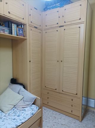 *Urge venta* Conjunto de muebles para habitación juvenil en buen estado. - Incluye armario ropero, cama nido con cajones y estanterías. - Muebles de madera en color beige claro. - Perfecto para una habitación juvenil o infantil.