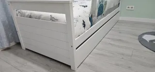 Cama nido de madera con un diseño moderno y funcional, ideal para optimizar el espacio. Es una cama alta porque permite tener tanto el colchón principal como el de la cama nido con el grosor de un colchón normal. - Estructura principal en madera, con acabado roble claro y detalles en blanco y marrón mate. - Diseño: Minimalista y funcional, con dos cajones integrados que aprovechan el espacio bajo la cama. Mucha capacidad - la medida del colchón es de 105 cm por 2 m de largo. - la cama nido se extrae a la altura de una cama normal. - Tiradores blancos para fácil apertura. - No incluye los colchones. Aunque sería negociable .