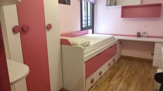 Se vende habitación juvenil está en muy buen estado, tiene 6 años y se ha retirado por la edad de la niña. Está desmontada en un guardamuebles por lo que la venta no está incluido el transporte ni el montaje de la misma, es una buena oportunidad para que tenga una niña una bonita habitación a un precio asequible.Como se ve en las fotos tiene escritorio, cama nido y armario rinconera, bajo del escritorio tiene un hueco para zapatero.