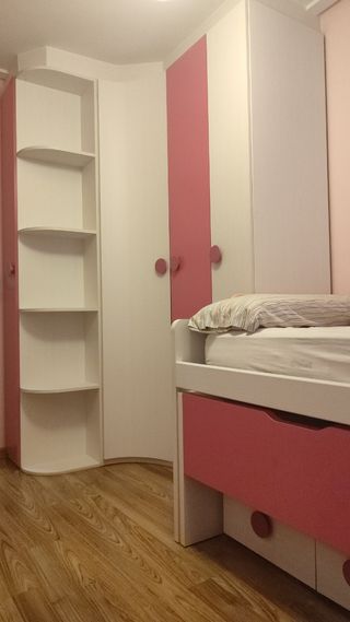 Conjunto de muebles infantiles en rosa y blanco, ideal para una habitación de niña. Incluye armario, cama nido con cajones y escritorio con estanterías. Los muebles están en buen estado y son muy prácticos. - Armario con dos puertas y espacioso interior. - Cama nido con cajones de almacenaje debajo. - Escritorio con estanterías integradas. - Estantería de esquina. Todo en perfecto estado.