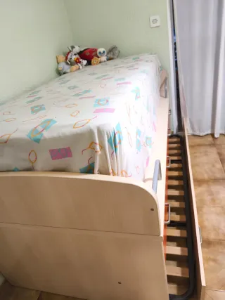 Cama nido doble con espacio de almacenamiento integrado. - Incluye colchón de 90 cm. - Diseño funcional y práctico. Falta el sumier de la cama de abajo, aunque tiene colchon igulmente. Tambien le falta manerales de los cajones inferiores. Lo demas se conserva en estado aceptable El largo de la estructura 2,15 metros. De ancho 110.