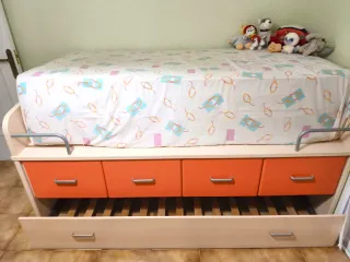 Se vende cama nido juvenil de muy buena calidad. Consta de dos camas y tres cajones muy amplios, con mucho espacio de almacenaje. La parte inferior sale completamente en bloque, lo que facilita la limpieza . Está en muy buen estado.