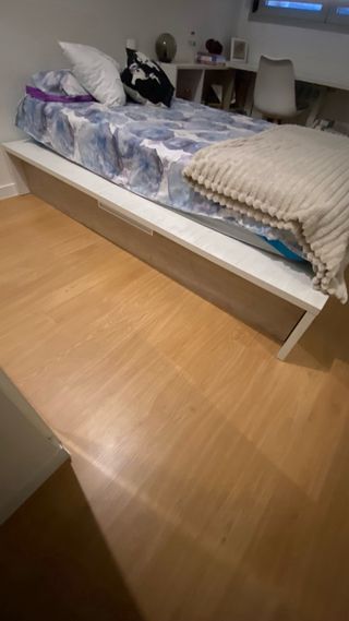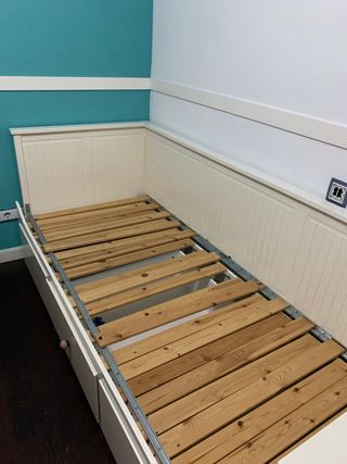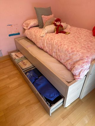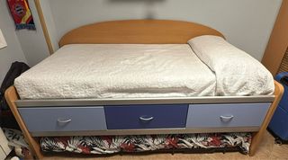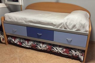 Cama nido juvenil con 3 cajones. Para colchón de 2m x 0,90m. La estructura mide 208x100 cm. La estructura de la cama es blanca. Los cajones son color madera. En perfecto estado. Colchón no incluido. También vendo mueble cabecero y escritorio. Todo el conjunto serían 250€.