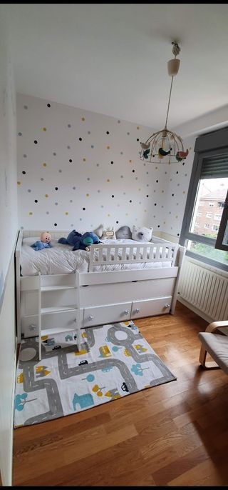 Se vende cama nido de madera maciza con varios complementos. - Incluye dos colchones. - Viene con un edredón. - Se incluyen cortina. - Se añaden dos cubos decorativos.