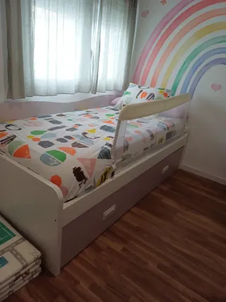 Cama nido con un diseño moderno y funcional, ideal para habitaciones infantiles. Cuenta con un somier adicional extraíble. Regalo colchon totalmente nuevo y la barandilla de seguridad. - Estructura de madera y plástico. - Acabado en color lila y blanco.