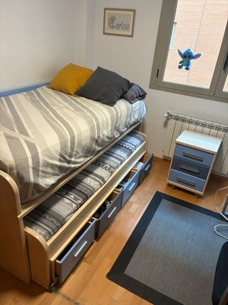 Cama nido de 90cm con espacio de almacenamiento. - Incluye dos colchones prácticamente nuevos - Cuatro cajones integrados de gran capacidad - Estructura de madera resistente Desmontaje y porte a cargo del comprador. Está en un edificio con ascensores.