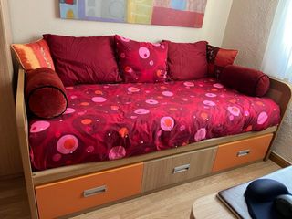 Cama nido con dos camas de 90 con espacio de almacenamiento integrado con 3 amplios cajones. La cama de arriba reposa sobre un cajón consistente y la segunda cama incluye somier de laminas y se desplaza fácilmente al llevar ruedas. Se regalan los dos colchones en muy buen estado; el de la cama inferior sin prácticamente uso. Incluye estructura, camas, somier y colchones. Ideal para aprovechar espacio. Altura muy cómoda y fácil de hacer ña cama de abajo ya que se desplaza sobre unas ruedas que no se ven. Tiene un pequeño desconchón debajo del colchón que no se ve ni afecta para nada( ver foto). De ahí el precio.