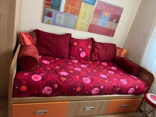 Cama nido de 90x190 cm con un colchón Natura de látex incluido. Ideal para aprovechar el espacio. - Estructura de MADERA - Cajones de almacenamiento en la parte inferior. - Diseño moderno con detalles en naranja y madera. - Está en perfecto estado Se vende por separado o junto con mesa de escritorio a parte que hace juego (75€)