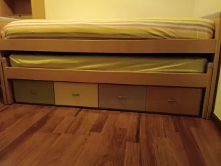 Se vende composicion de cama nido compuesto por 2 camas una de 190x 90 y la otra de 180x 90 mas estructura de 4 cajones contenedores. De muy buena calidad y colores haya y roble claro. Tambien hay la posibilidad de vender el dormitorio al completo. 2 Armarios de 60+ mesa estudio con zapatero y cajonera+ estanteria puente y estanteria sobremesa. Todo de primera calidad no es un dormitorio de folleto ni barato. Repito dormitorio juvenil de primer nivel.+ Info aqui. Conjunto completo 950€