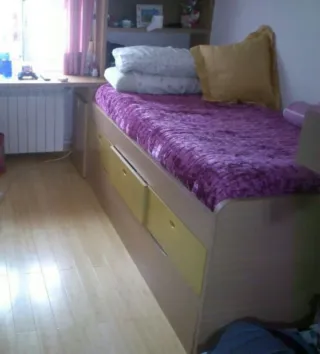Cama nido 203x84x100 de madera en tonos madera clara, con cajones blancos y lilas. La estructura de la segunda cama la tenemos desmontada. La segunda cama queda completamente escondida, no se queda al aire el colchon y tiene tirador para sacarla. El somier tiene las tablas perfectas😊 Tenemos la opción de venderlo con colchones incluidos GRATIS FOTOS DE LOS COLCHONES AÑADIDAS - Colchones de: 190cm x 90cm -Estantería a juego - Cuatro cajones amplios. - Estructura de madera en buen estado. Tiene algunas rozaduras por culpa de los que nos hicieron la mudanza en su momento 😫 por 20€ más te lo llevo y lo monto