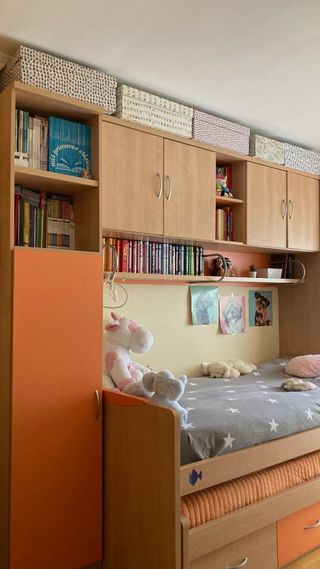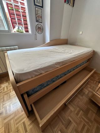 Cama nido de banak de 90x190 + dos colchones. El colchon inferior a estrenar y el superior en muy contadas ocasiones con alguna visita. Se compró todo en mayo de 2023, por lo que tiene menos de 3 años. Las 2 camas se quedan a la misma altura al abrir la inferior. - Estructura material: tablero laminado técnico. - Somier superior: bastidor metálico y lamas de madera). - Somier inferior: de arrastre elevable con patas incluido (somier: bastidor metálico y lamas de madera).