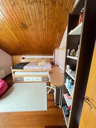 Magnifico dormitorio de madera maciza muy bueno. muy espacioso, con mucha capacidad en los cajones de debajo de la cama. Dos camas la de arriba y una nido. El dormitorio consta de la estructura de la cama, una estanteria colgante, dos estanterias de pie y una mesita con cajoneras y ruedas. Muy practico. Hay un zapatero que se puede negociar.
