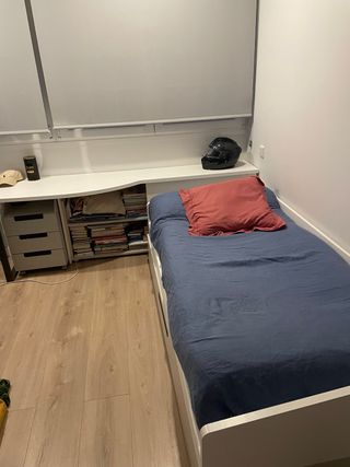 Cama nido 1.90x90 (pequeño desperfecto en parte tarsera que no afecta a la cama)+ cajonera, 1.96 x0.67, (Tiene 2 cajones) + 1 mesilla + dos estanterias+ escritorio con bajo puerta extraible para almacenaje. Color crema. Regalo de un colchón.