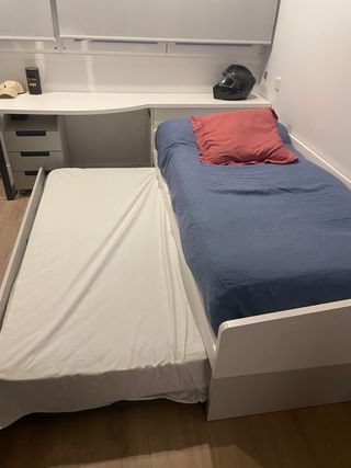 Cama nido,color blanco,con 4 cajones en el centro, con tiradores redondos y mucha capacidad para almacenaje.Incluye el colchón 190x090 (fino e impecable) de la cama secundaria (de abajo).No incluye el colchón de la cama principal (de arriba).Medidas: -cama: 202 cm largo, 100 cm ancho y 71 cm alto; cabeceros en laterales: 110 cm de alto. -cajones: 48 cm de largo, 29,5 cm de alto y 82 cm de fondo. La cama de abajo (somier de láminas) se saca fácilmente porque tiene ruedas y las patas se despliegan para no dormir a ras de suelo. La cama está en muy buenas condiciones pero, por el uso de 15 años,hay 3 desgastes básicamente (ver fotos