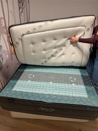 Cama canguro, reforzada de 5 barras de tubo de acero de 30 x 30 mm + Tablero de 10mm de grosor + tapizada en tejido 3D sobre espuma de 10mm de densidad 20 kg/m³. 1 colchón Ingeaviry Innobed de 105x190cm de muelles ensacados + 6cm Viscoelastica + refuerzo perimetral. 1 colchones de 90x190 cm de HR alta densidad.