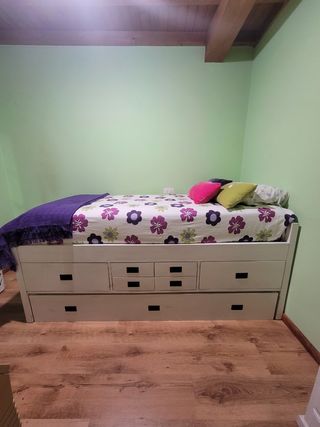 Cama nido de madera, color banco, con cajones (2 grandes y 4 pequeños), para colchón de 90. Cama muy bien cuidada y con mucho almacenaje. Comprada en Banak. Medidas (Largo x Ancho x Alto): 210x100x102 estructura 190×90x53 cama nido 90×200 somier 80x30x10 cajones pequeños 85×62x19 cajones grandes